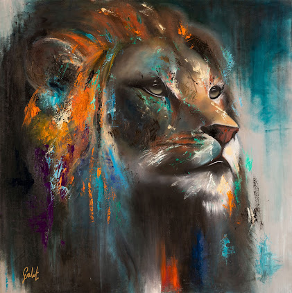 The lion’s face, painted with precision yet softened through an impressionistic lens, draws the viewer in with its piercing gaze. There is a thoughtful, almost melancholic quality in the eyes, as though the animal is contemplating its role as a symbol of majesty and power. Galit’s unique approach to portraying the lion blends realism with abstraction. While the basic structure of the lion’s face is carefully articulated, swirls of color—ranging from vivid oranges and reds to cool blues and purples—cascade across its mane, suggesting movement, life, and energy that extend beyond the canvas.