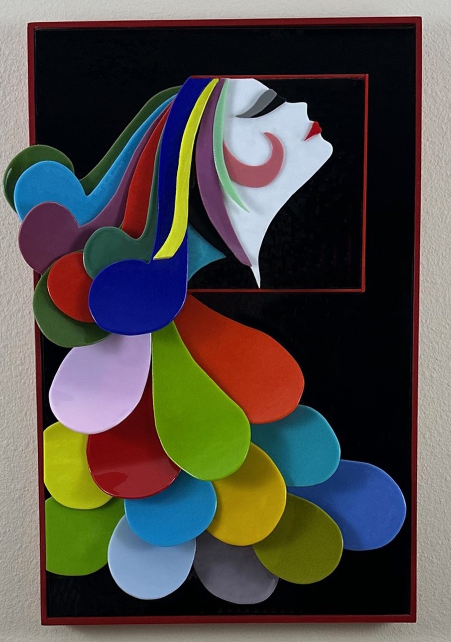 Rendered entirely in colored sheet glass and mounted within a wooden frame, Just Curls is more than a portrait; it is a sculptural symphony of color, form, and emotion. The artist, who immigrated to the United States as a child refugee post-World War II and built a lifelong career in design and fine art, channels his lifetime of experiences into this work, weaving resilience, beauty, and individuality into every curve.