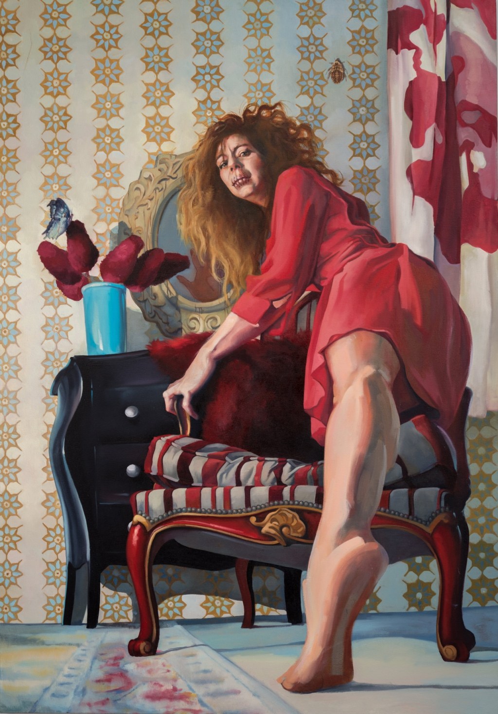 Color plays a critical role in amplifying the emotional stakes. The red of the dress commands attention—passionate, powerful, but also perilous. It contrasts sharply against the ornate yet claustrophobic wallpaper and the chilly elegance of the teal vase, creating a dissonance that mirrors the conflict within the subject. A richly textured carpet, lush velvet pillows, and ornate furnishings root the piece in a domestic interior, yet the psychological atmosphere is anything but comforting.