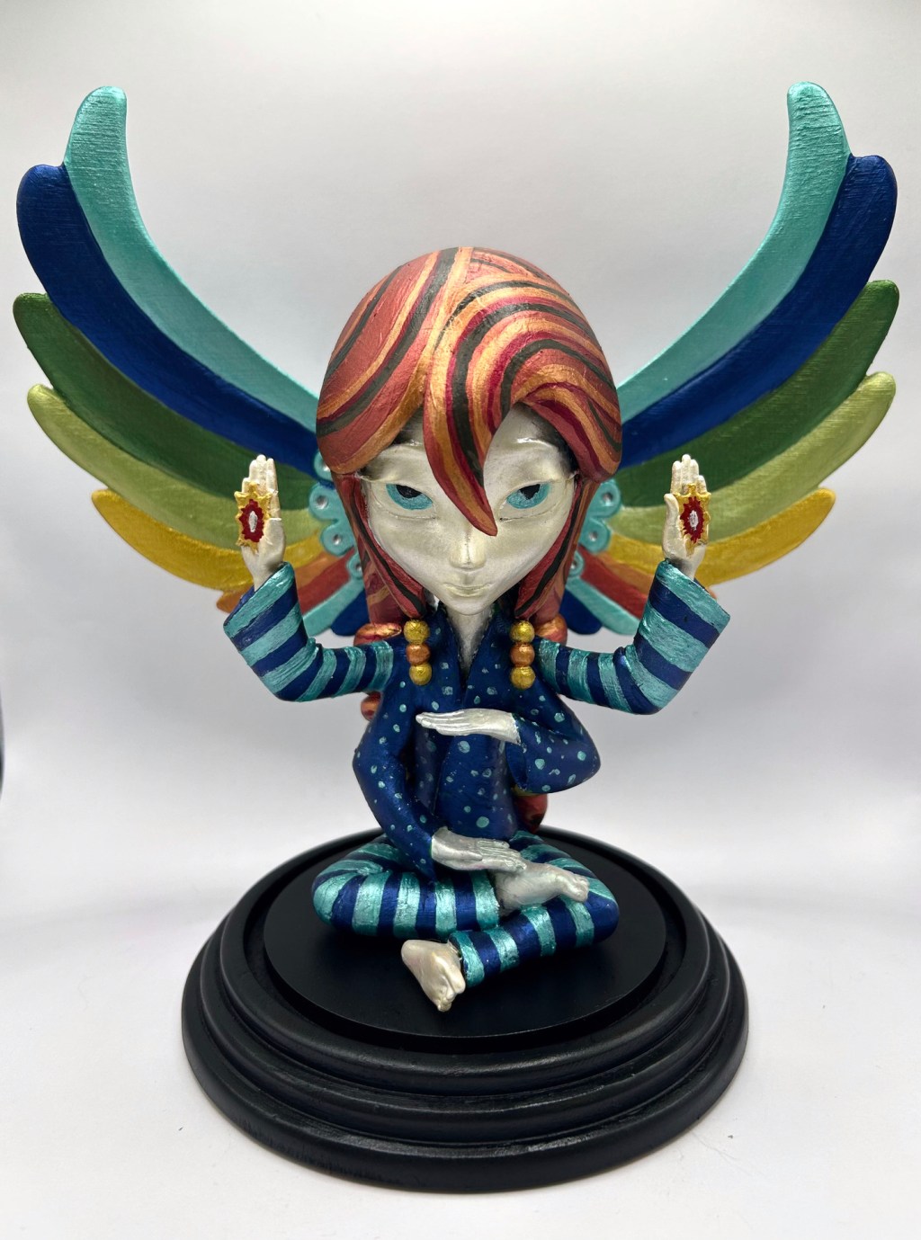 An ethereal figure with ocean-toned wings, four graceful arms, and a gaze that seems to see through centuries—Prometheus by Moksha Mobias arrives not as a chained Titan of old, but as a spiritual guide bearing gifts for the future. Presented in the 2nd Annual Toys and Joys 2025 international smart exhibition, this painted resin sculpture offers a luminous reimagining of one of mythology’s boldest archetypes. But here, fire is not stolen—it is sanctified. Not punishment, but peace.
