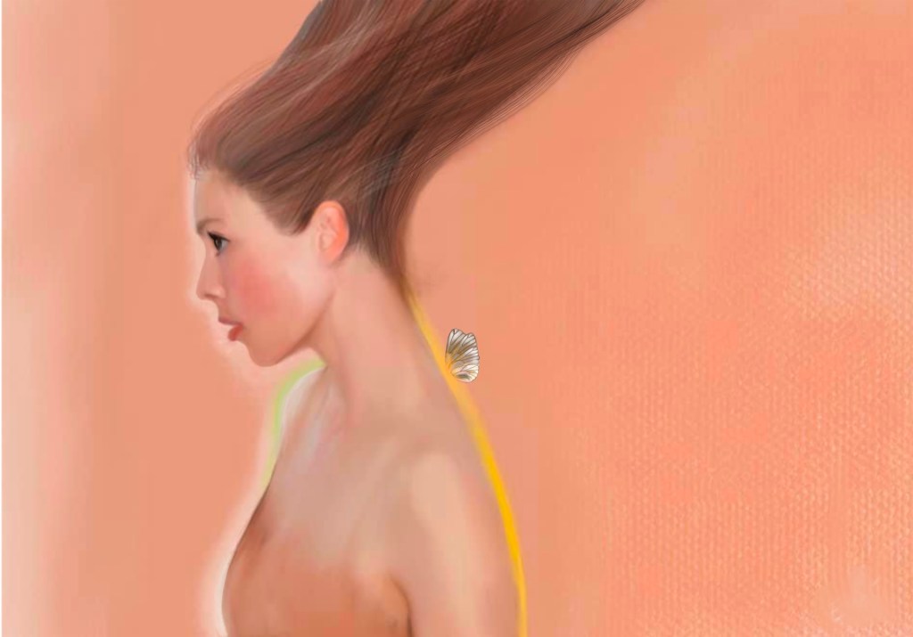 Set against a muted, warm-toned backdrop that resembles bare skin or raw canvas, the female figure leans forward in profile, eyes cast inward, as if caught between motion and memory. A single delicate wing—almost translucent—emerges from her upper back, disrupting the anatomical with a hint of surrealism. It’s this small, almost hesitant element that transforms the piece: a symbolic gesture of quiet strength, vulnerability, and unrealized flight. The title Tiny Wings becomes a metaphor not for escape, but for the tender emergence of self.