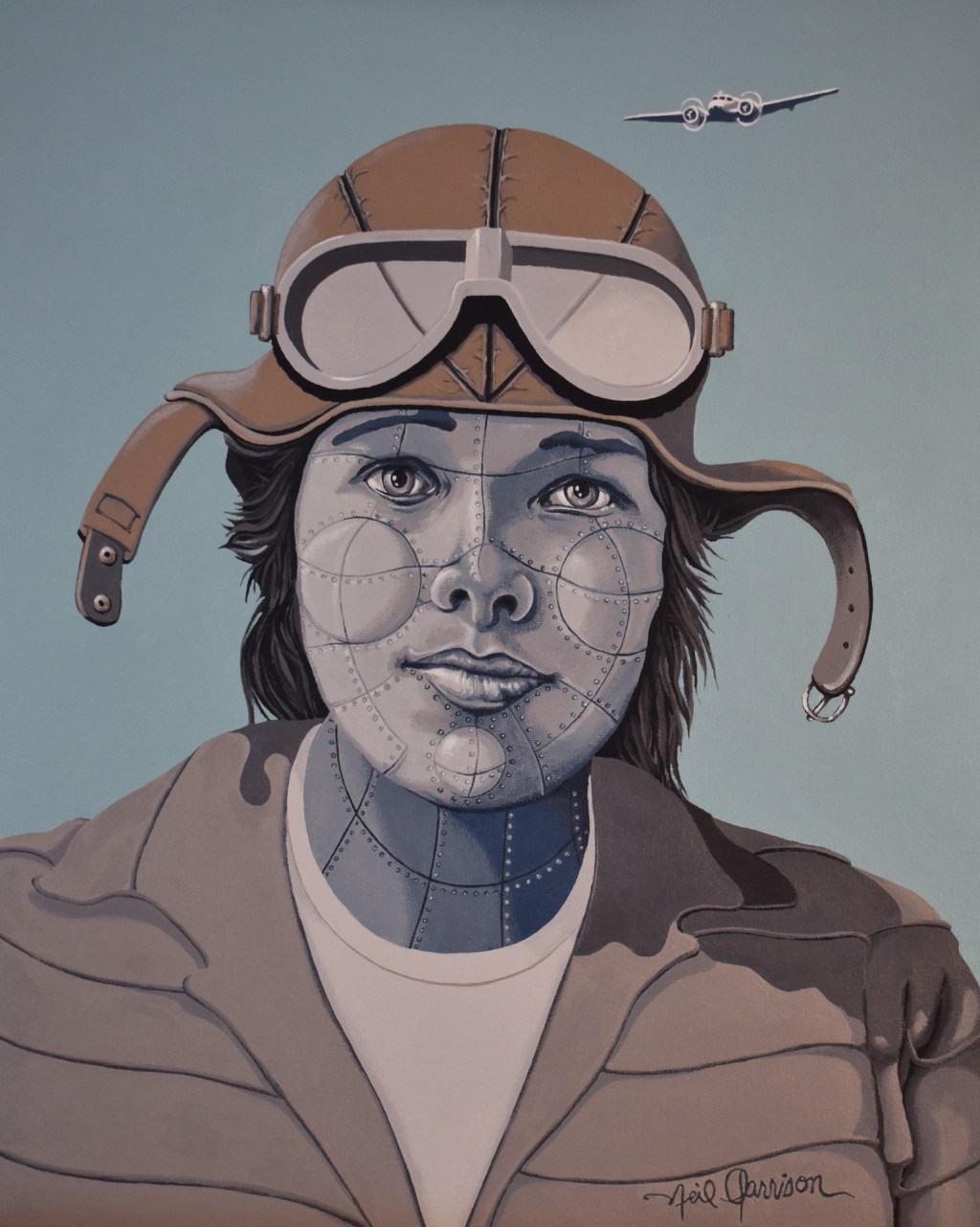 Selected for The Sky Above – 2025 international exhibition, this acrylic painting on canvas honors not only the iconic aviator but also the deeper yearning for autonomy, ambition, and elevation. The composition is clean yet resonant: Earhart’s gaze is steady, confident, and deeply human—yet her skin is rendered as airplane fuselage, marked with rivets, seams, and circular mechanics that suggest both technical precision and the quiet heroism of flight.