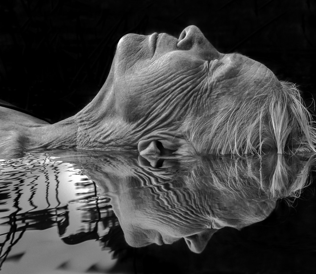 At first glance, we see an elderly woman, her face gently emerging from and mirrored in still water. The portrait floats between serenity and dissolution, blurring the line between the real and the reflected. The water acts not just as a medium of distortion but as a partner in storytelling. The ripples merge seamlessly with the wrinkles on her skin, creating a visual poem of time’s passage. This poignant metaphor elevates the image beyond portraiture into a universal reflection on aging.