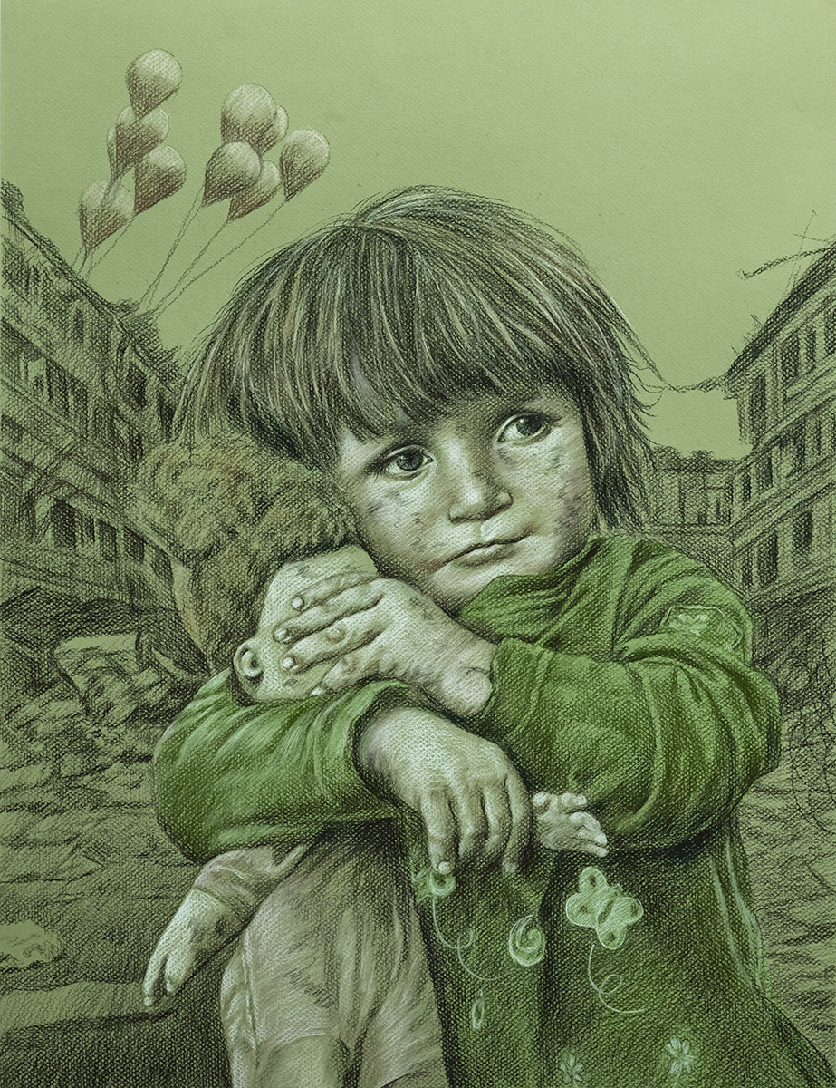 Rendered on softly textured green-toned sketch paper with colored charcoal, the piece is both tender and devastating. The child’s grip is tight, almost adult—an instinctive attempt to protect what little remains of comfort. The battered teddy bear in her arms reflects the broken surroundings behind her: skeletal ruins, rising smoke, and a world where safety has vanished. Faint, ghostlike balloons drift upward, perhaps remnants of a birthday now forgotten or dreams that no longer belong to this world.
