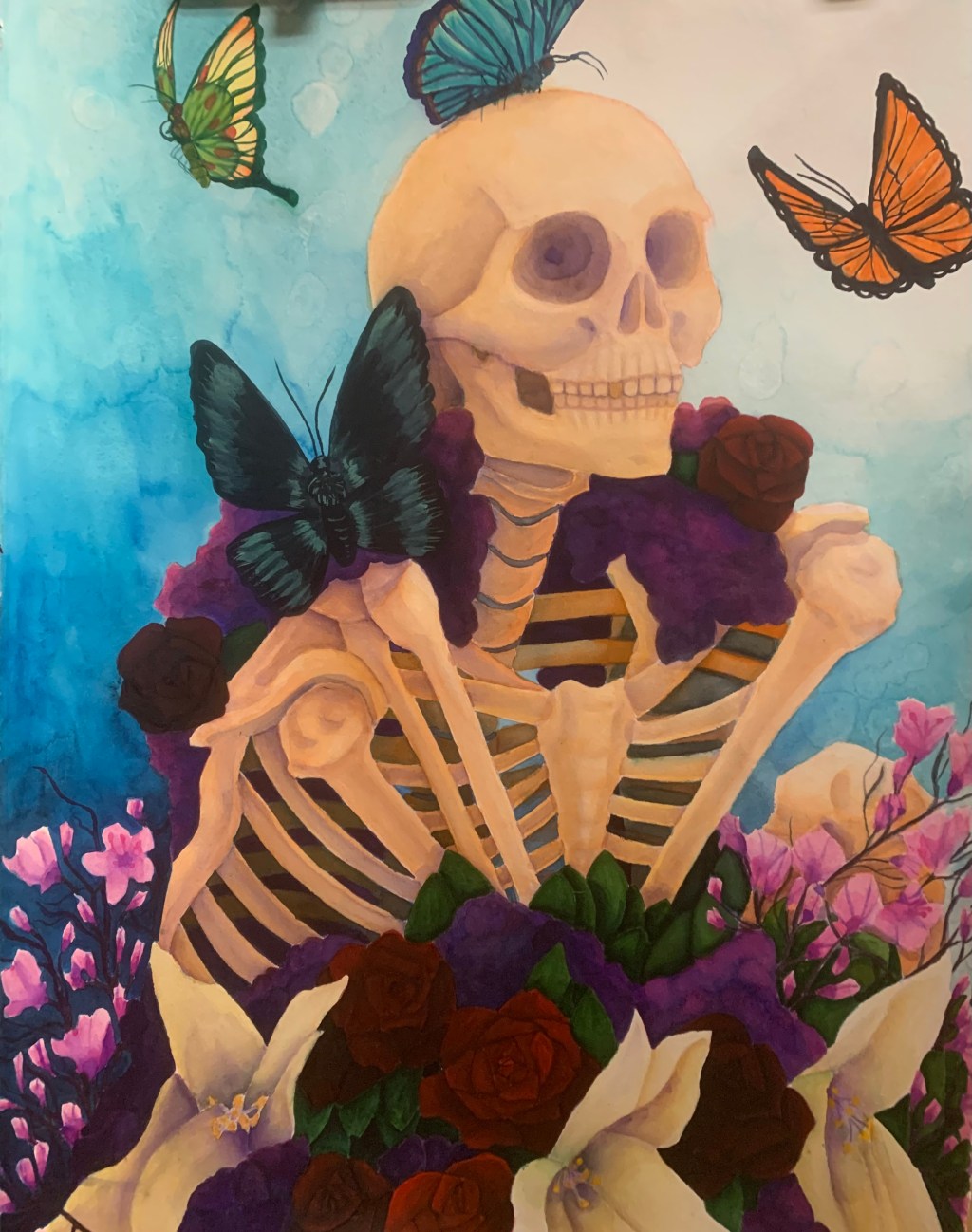 Some artworks unfold slowly, like a whispered memory returning from a dream. Marialynda Valdez’s Afterlife is one such vision. Arresting yet tender, this watercolor painting captures the gaze with its delicate balance of fragility and splendor. At its center, a skeleton rises not as a symbol of fear or decay, but as a monument to transformation. It gazes upward, serene and unburdened, surrounded by a lush bloom of roses, lilies, and lilacs, while vibrant butterflies drift around its form like sacred omens in mid-flight.