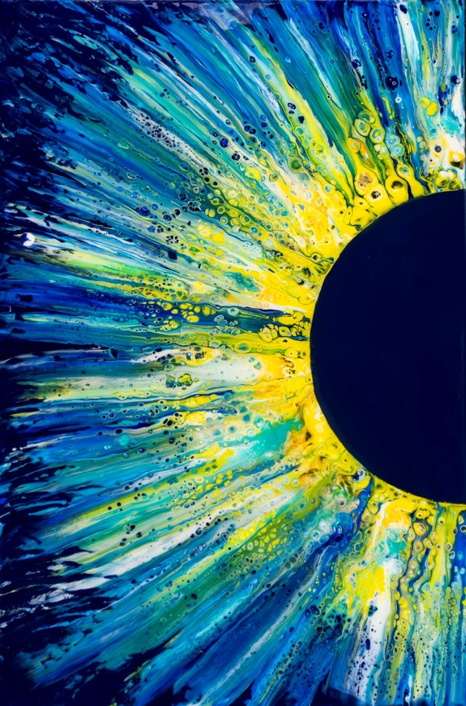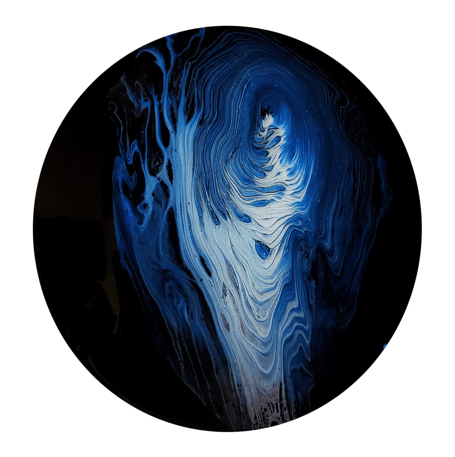 It started organically. I was drawn to fluid art for its unpredictability—it mimics life. Now, I use it as my initial starting point, but then I use other techniques that help shape the colors into form.