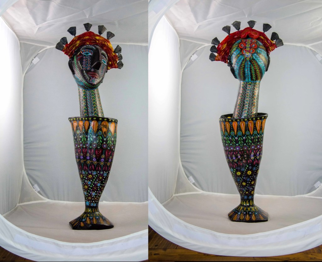 Teel’s background across multiple disciplines, fiber, metal, clay, and stone, is evident in the tactile richness of the piece. The crown, with its textured red surface and dark protrusions, introduces a sculptural contrast to the smooth, painted body. It feels both organic and constructed, a symbol of earned authority rather than inherited power. This queen is not ornamental, she is experiential, shaped by process, time, and intention.
